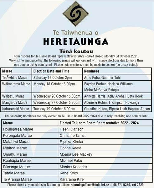 Amo Puha & Gunther Tuhi the election process will be held at Te Awhina Marae, on the 16th of October 2021 @ Te Awhina Marae
